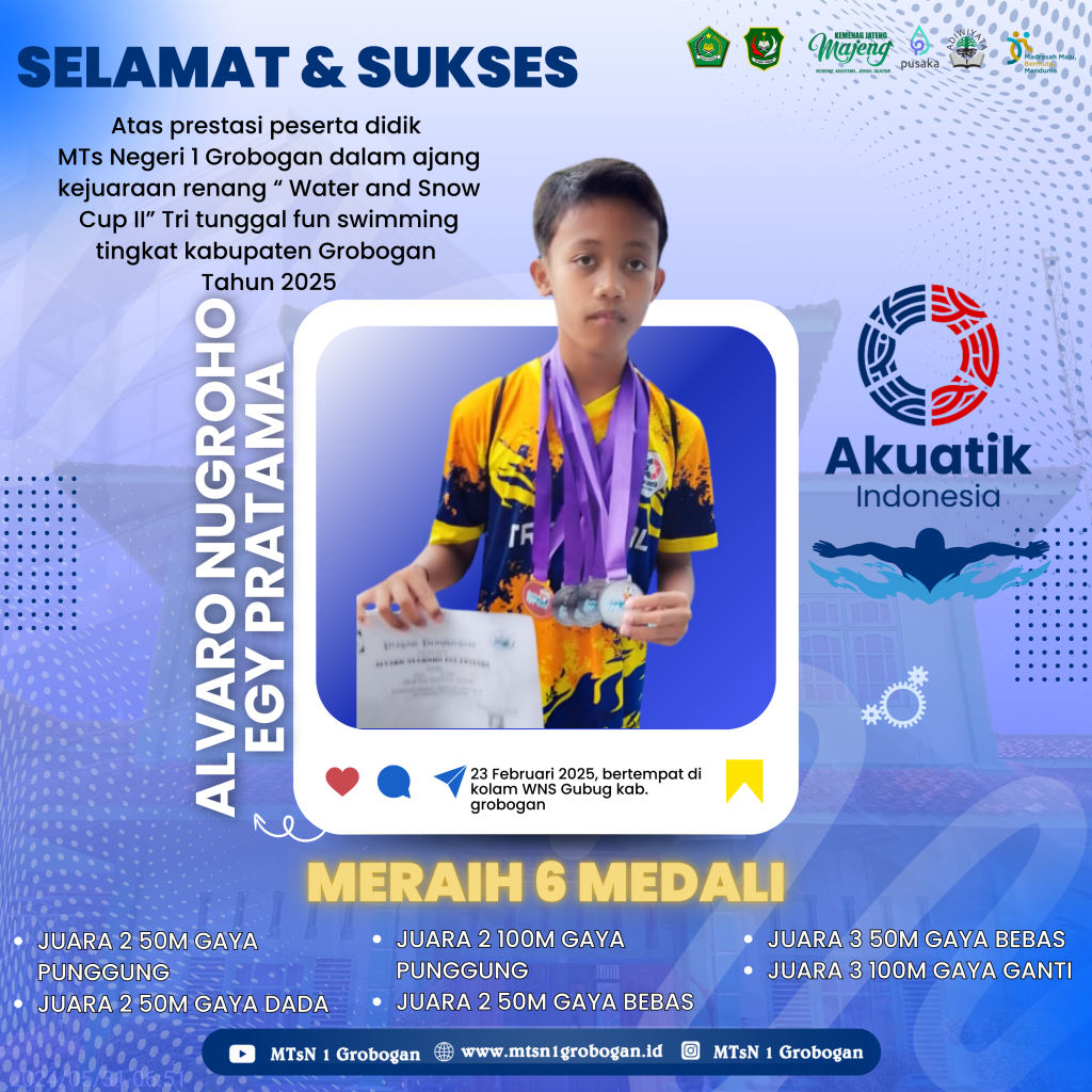 PESERTA DIDIK MTsN 1 GROBOGAN MERAIH 6 MEDALI DALAM KEJUARAAN RENANG WATER AND SNOW CUP II TINGKAT KABUPATEN GROBOGAN TAHUN 2025
