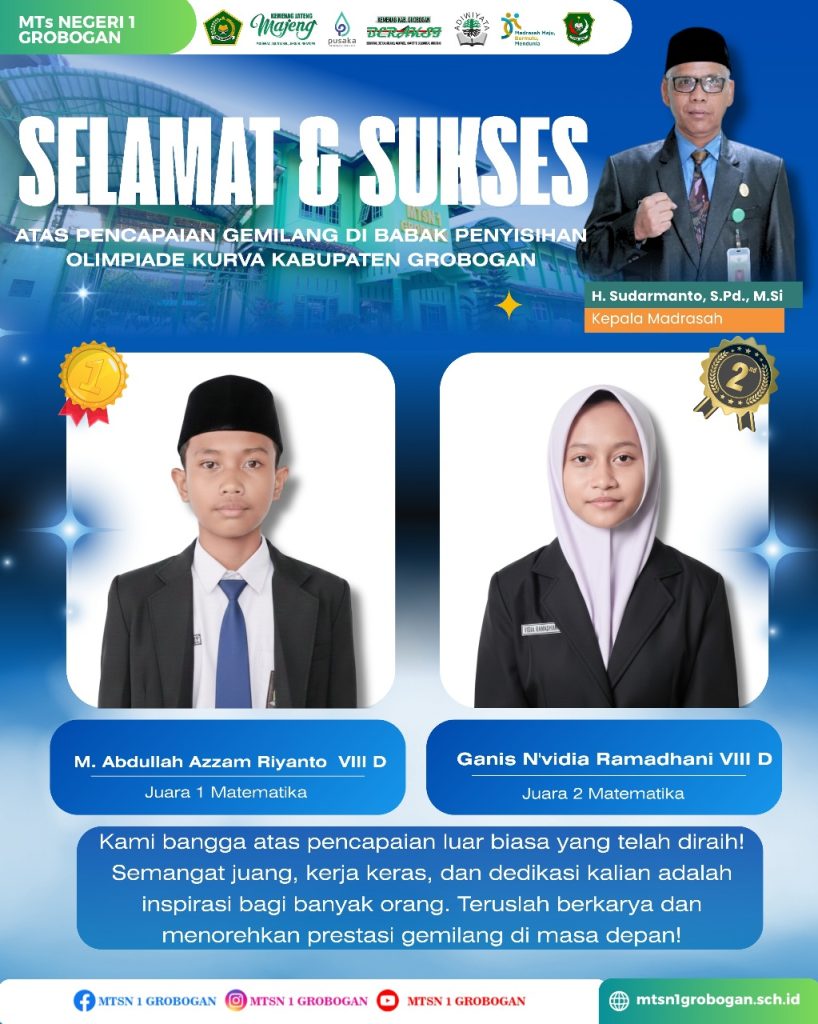 Grobogan — Prestasi membanggakan kembali ditorehkan oleh siswa-siswi MTs Negeri 1 Grobogan dalam babak penyisihan Olimpiade Kurva tingkat Kabupaten Grobogan. Pada ajang bergengsi ini, para siswa berhasil meraih hasil gemilang di bidang Matematika dan Sains, sekaligus mengukuhkan kualitas akademik madrasah di tingkat kabupaten. Di bidang Matematika, M. Abdullah Azzam Riyanto (kelas 8D) tampil luar biasa […]
