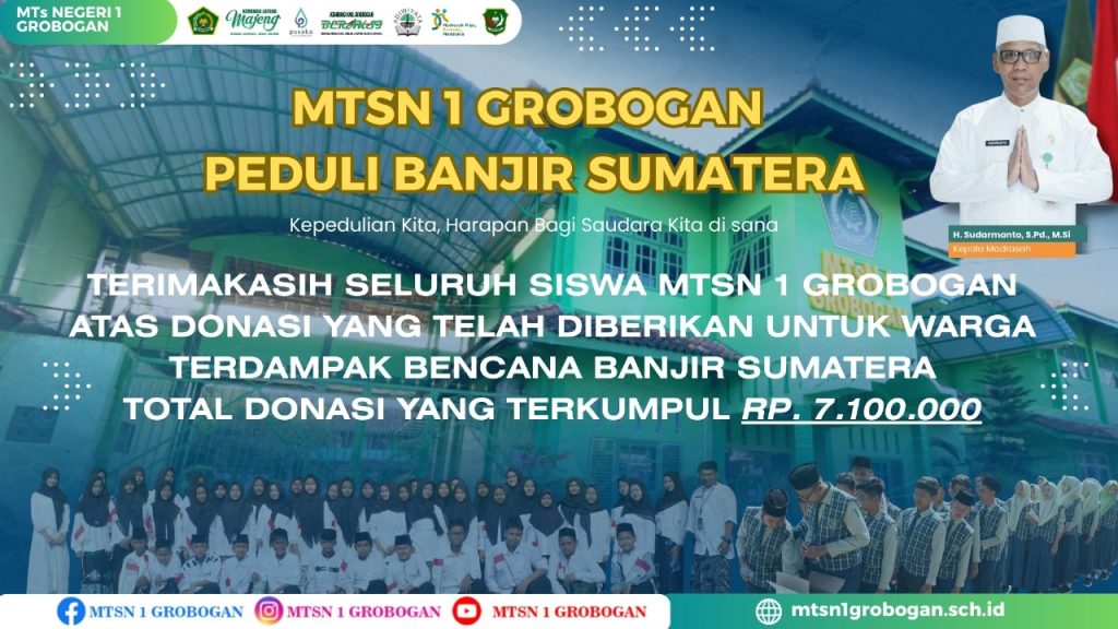 Grobogan — Kepedulian dan empati kembali ditunjukkan oleh siswa-siswi MTs Negeri 1 Grobogan melalui aksi penggalangan dana bagi saudara-saudara di Sumatra yang terdampak bencana alam. Dari kegiatan donasi yang dilakukan secara sukarela, terkumpul dana sebesar Rp7.100.000 yang selanjutnya disalurkan untuk membantu para korban bencana. Penggalangan dana ini melibatkan seluruh siswa dengan pendampingan guru dan OSIS […]