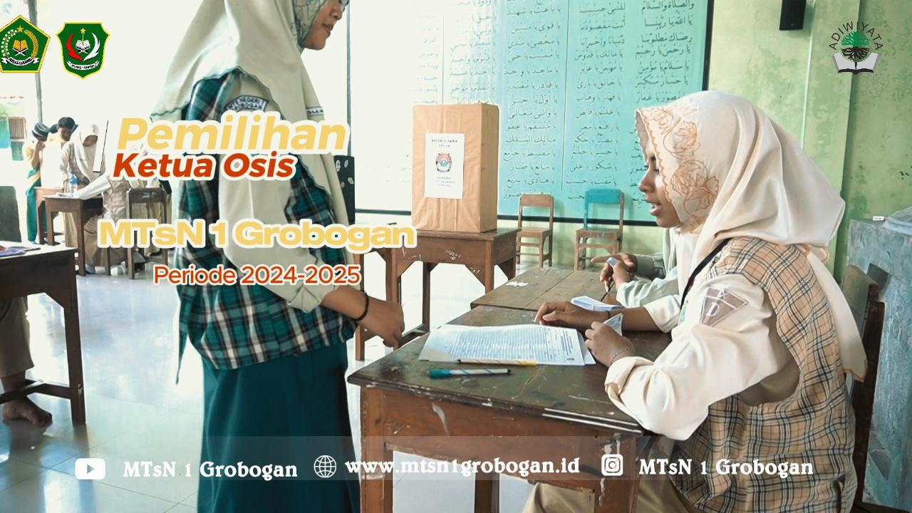 Pemilihan Ketua Organisasi Siswa Intra Sekolah (OSIS) di MTsN 1 Grobogan menjadi ajang para siswa untuk belajar berdemokrasi. Proses pemilihan digelar layaknya pemilu, beberapa atribut pendukung pemilu seperti daftar hadir, bilik suara , kotak suara, papan penghitungan, surat suara, petugas pemilu, dan tinta lengkap teresedia. Kegiatan pemilihan ini berlangsung pada hari Jumat, 9 Oktober 2024 pada jam 08.00 – 10.30 WIB bertempat di mushola madrasah.